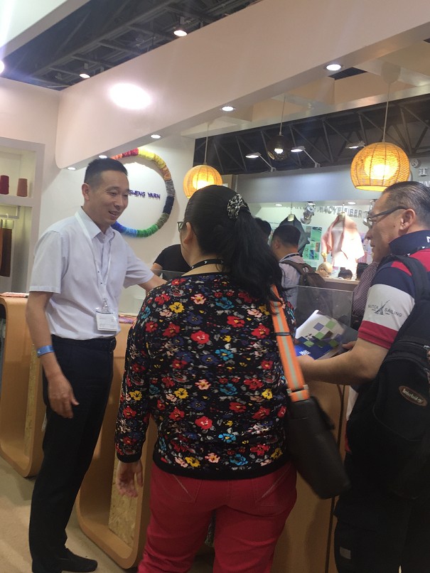 我們的展位現(xiàn)場人山人海,前來咨詢洽淡的客戶絡(luò)繹不絕。總經(jīng)理也在親自向客戶介紹我們的各種花式紗。