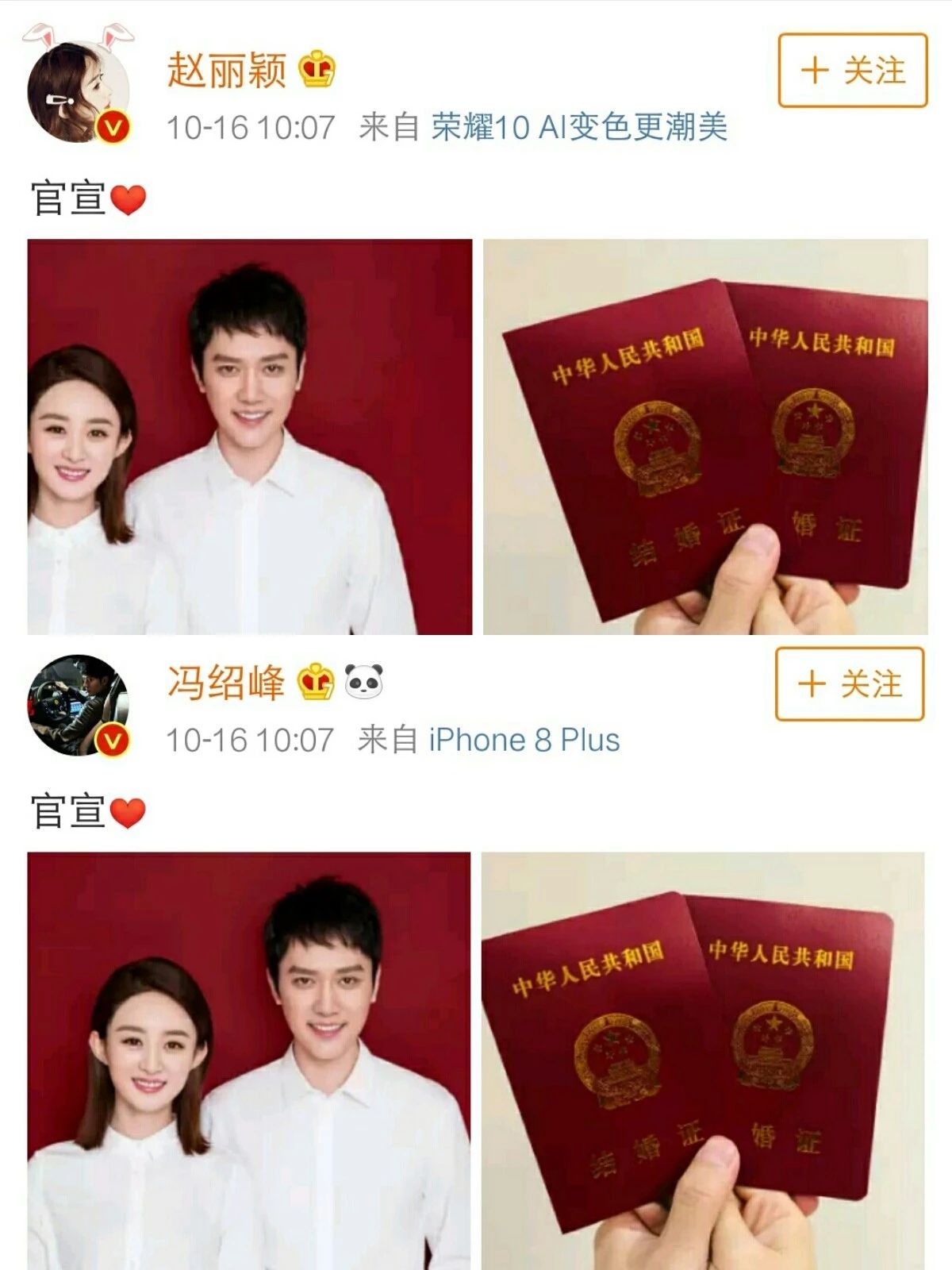 太突然了,趙麗穎和馮紹峰已經(jīng)領(lǐng)結(jié)婚證了!