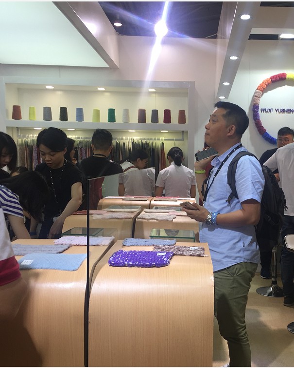 我們的展位現(xiàn)場人山人海,前來咨詢洽淡的客戶絡(luò)繹不絕??偨?jīng)理也在親自向客戶介紹我們的各種花式紗。
